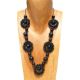 Collier en bois original, avec gros pendentif en bois teinté brun très foncé presque noir.